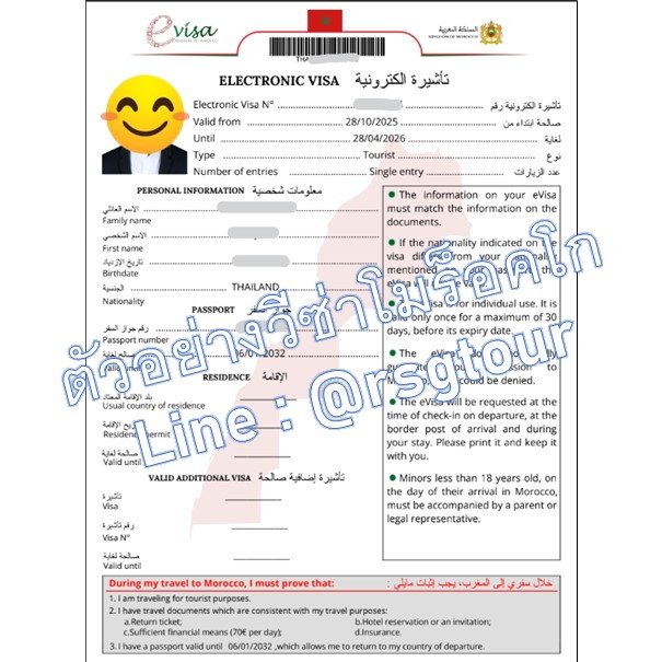 วีซ่าจะออกเป็นElectronic Visa ส่งกลับให้คุณลูกค้าทางไลน์ ภายใน 5 วันถัดไป ซึ่งผู้เดินทางจำเป็นต้องพิมพ์ E-Visaนี้และแนบกับพาสปอร์ตตอนเข้าประเทศโมร็อกโก